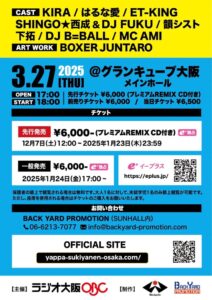 勝手に万博前夜祭 『YAPPA!好きやねん OSAKA』 ~KANSAI CLUB MUSIC FES~ EVENTS 2025年3月27日(木) @グランキューブ大阪メインホール < CAST > KIRA はるな愛 ET-KING SHINGO★西成 & DJ FUKU 韻シスト 下拓 DJ B=BALL 窪塚洋介 MC AMI ART WORK:BOXER JUNTARO OPEN / START:17:00 / 18:00 【先行発売】※e+独占発売 12月7日(土)12:00 ~ 25年1月23日(木)23:59 【一般発売日】※e+独占発売 25年1月24日(金)17:00 ~ 【チケット情報】 先行チケット…¥6,000 (プレミアムREMIX CD付き) 前売りチケット…¥6,000 当日チケット…¥6,500 【プレイガイド】 e+イープラス(先行前売) https://eplus.jp/kcmf/ 保護者の膝上で観覧される場合は無料です。大人1名に対して、未就学児1名のみ膝上観覧が可能です。 ただし、座席を使用される場合はチケットのご購入をお願いいたします。 【お問い合わせ】 OFFICIAL SITE:https://yappa-sukiyanen-osaka.com/ BACK YARD PROMOTION(SUNHALL内):06-6213-7077 / mail: info@backyard-promotion.com 【主催】 ラジオ大阪 【制作】 WAKA JAPAN / BACK YARD PROMOTION